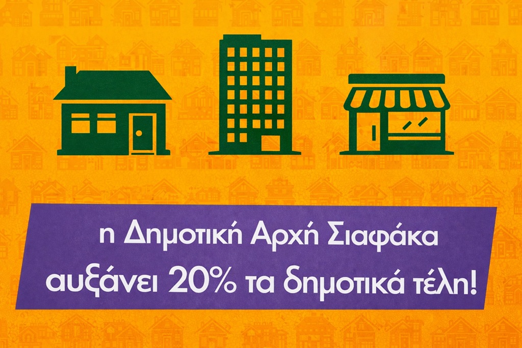 Η Δημοτική Αρχή Σιαφάκα επιβαρύνει με αύξηση 20% στα δημοτικά τέλη όλες τις κατοικίες, τα εμπορικά καταστήματα και τους επαγγελματικούς χώρους, για το 2026