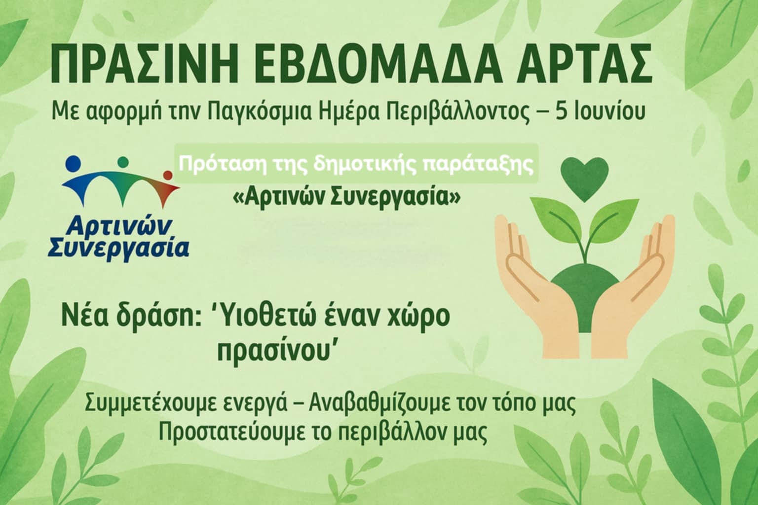 Με αφορμή την Παγκόσμια Ημέρα Περιβάλλοντος (5 Ιουνίου), η δημοτική παράταξη «Αρτινών Συνεργασία», μέσω του επικεφαλής της Χρήστου Τσιρογιάννη, κατέθεσε επίσημη πρόταση στο χθεσινό Δημοτικό Συμβούλιο Αρταίων για την καθιέρωση της “Πράσινης Εβδομάδας Άρτας” και την υλοποίηση προγράμματος συμμετοχής των πολιτών με τίτλο “Υιοθετώ έναν χώρο πρασίνου”.
